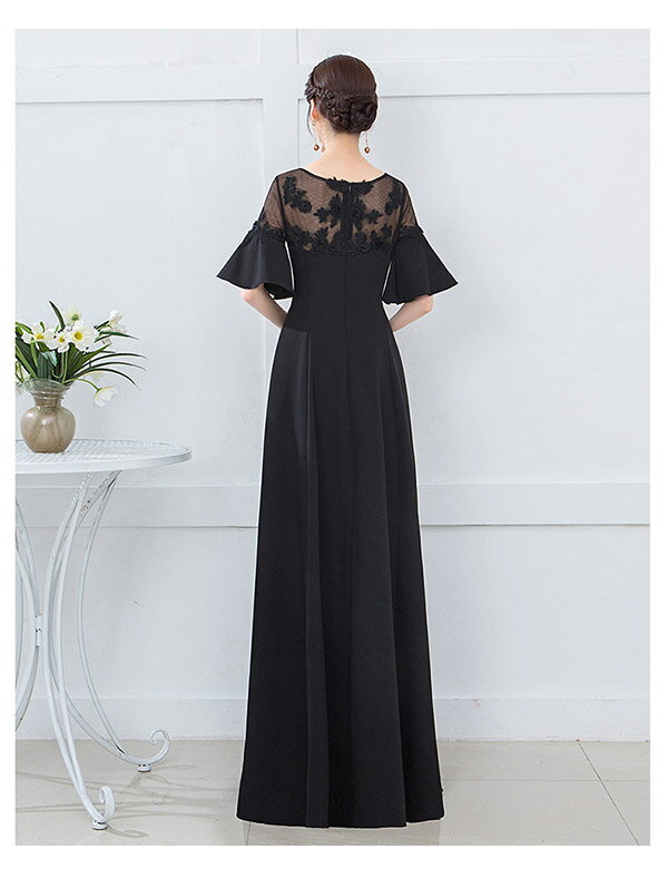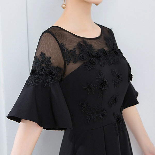 ロングドレス 演奏会 ピアノ 発表会 パーティードレス ブラック 黒 レディース 透け感 ファスナー ラウンドネック シースル襟 フレア袖付き 半袖あり ロング丈 結婚式 母親 ドレス フォーマル お呼ばれ 袖あり 大人 dh035l6l6l6