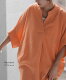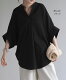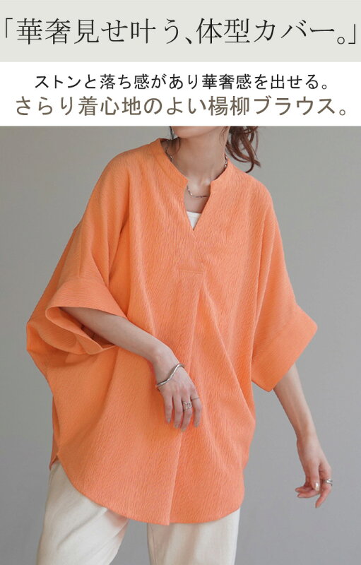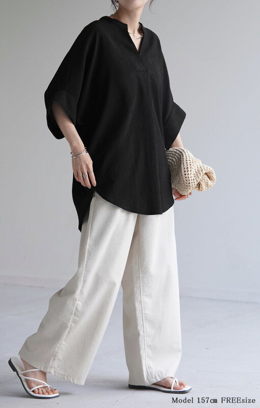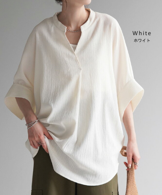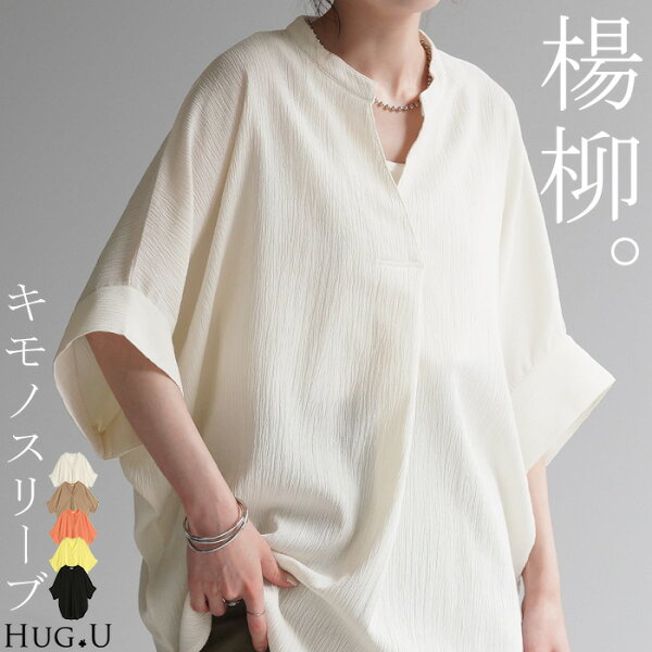 ブラウス 楊柳 キーネック レディース ■一部7月中旬入荷 シャツ トップス シアー ロング チュニック 二の腕カバー フレア袖 スキッパー ゆったり ドルマン レイヤード お尻が隠れる 無地 半袖 変形シルエット 体型カバー きれいめ 大きいサイズ 白 黒 春 夏 HUG.U