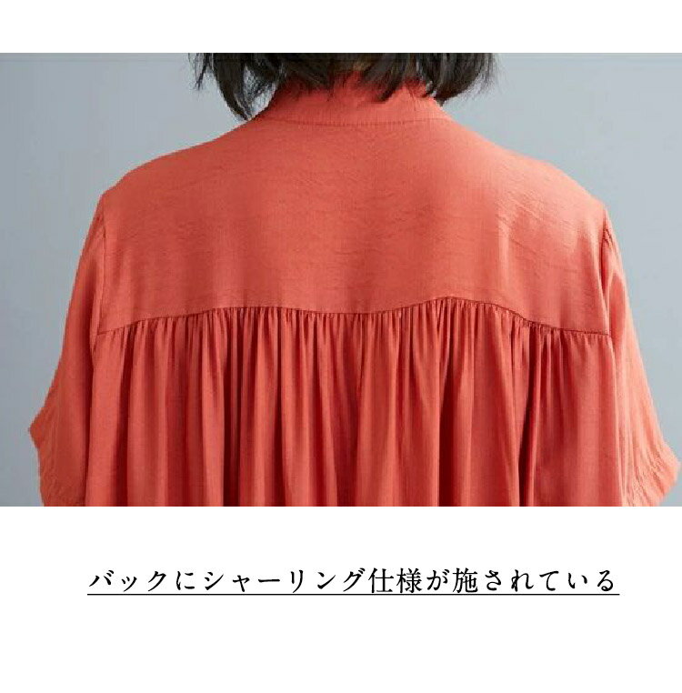 【スーパーSALE特別価格2400円&P5倍!】チュニック シャツ 半袖 半袖シャツ 羽織り 立ち襟 ギャザー フレア ロング 前開き ドルマンスリーブ ドロップショルダ 大きいサイズ ゆったり ビングシルエット トップス 春 夏 レディース ロングシャツ 半袖チュニック 大人可愛い
