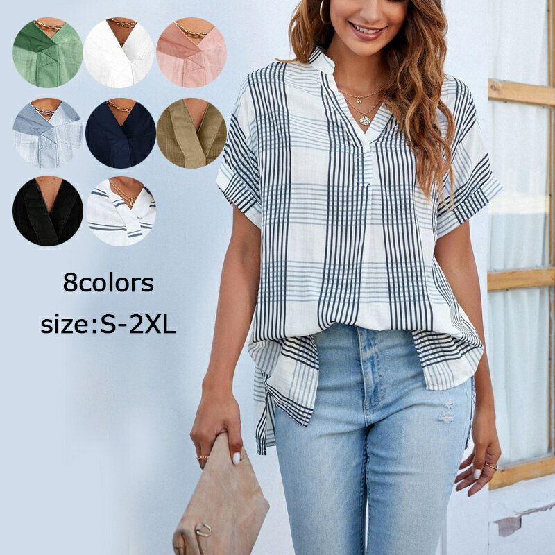 チュニック ブラウス シャツ レディース 半袖 シャツブラウス フレンチスリーブ ゆったり プルオーバー ロング タック ギャザー スリット入り スキッパーカラー アシンメトリー トップス レディース 春夏 大人可愛い ストライプ チェック柄