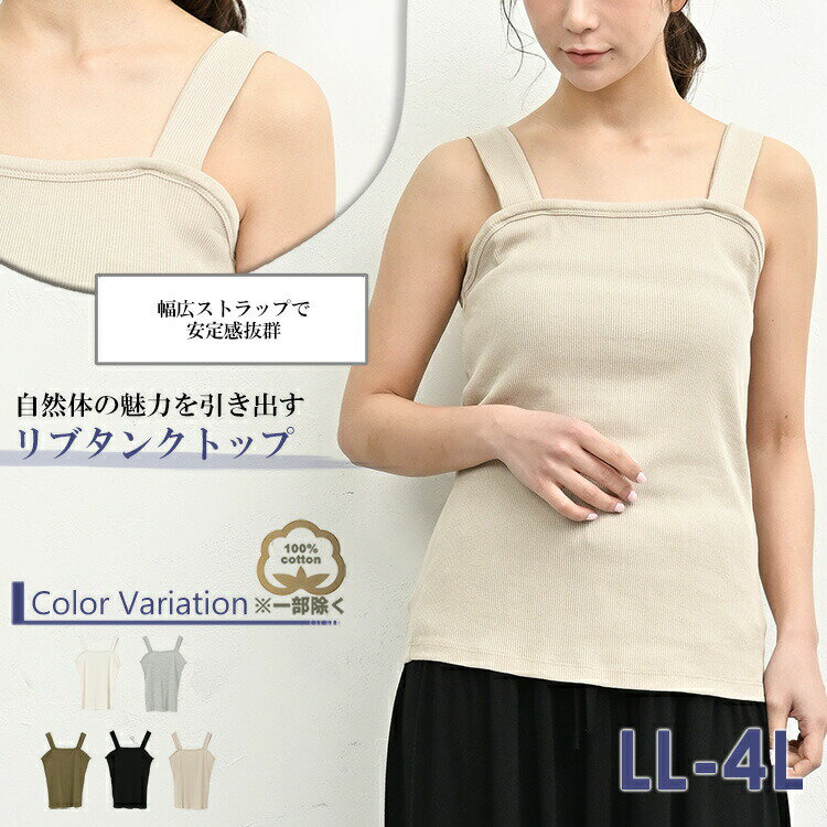 【メール便送料無料】大きいサイズ レディース タンクトップ リブ編み 幅広ストラップ インナー トップス cotton100 LL/3L/4L ゆったりサイズ ぽっちゃり女子 プラスサイズ