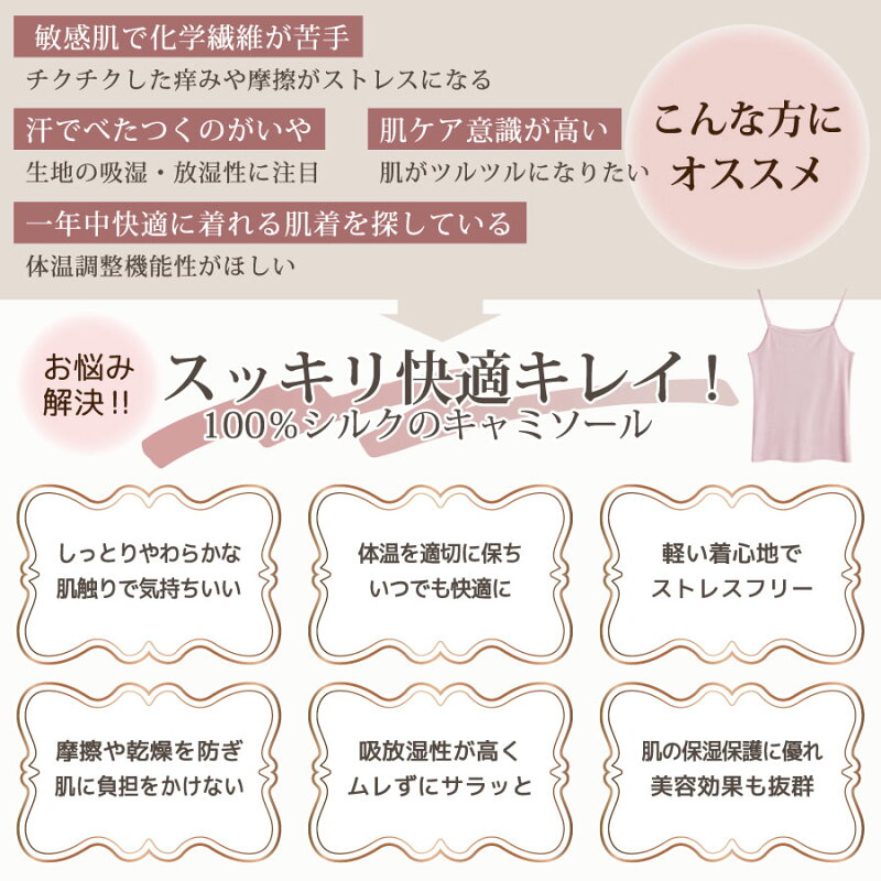 しっとりとろみのフレーズ通り肌に優しいシルクキャミソールです。