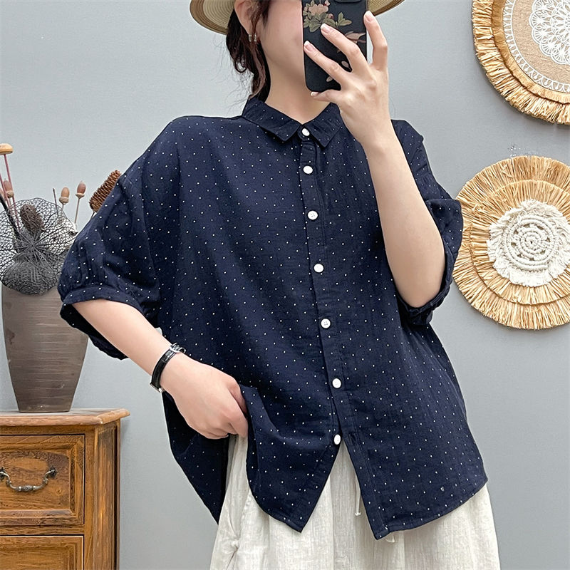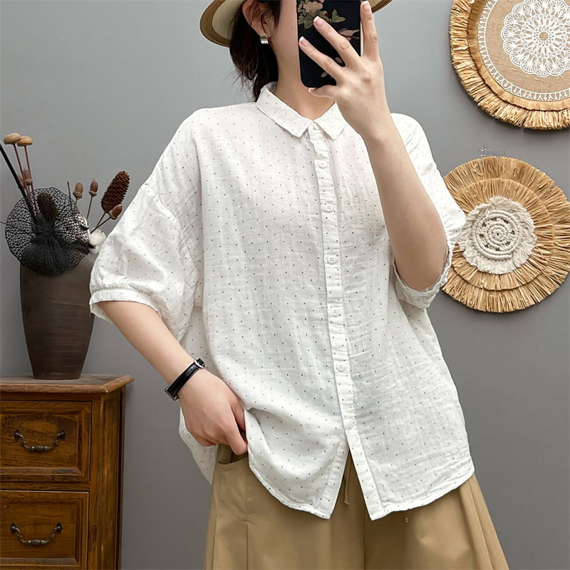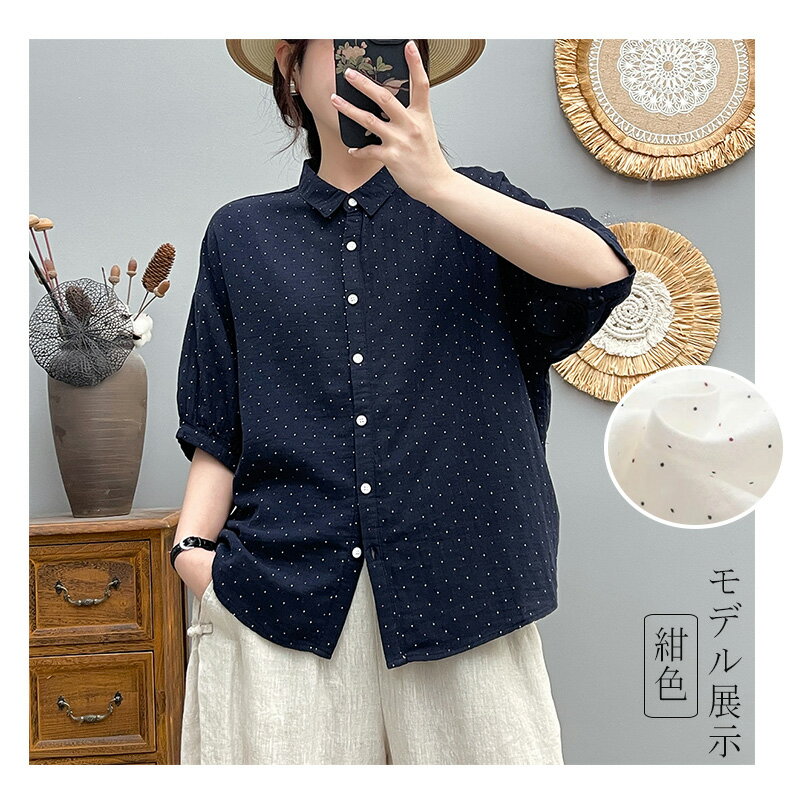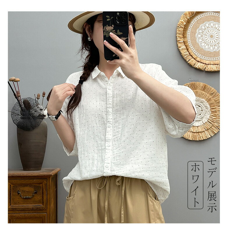 【翌日発送・SS期間限定2480円+P5倍】シャツ トップス レディース ブラウス 半袖シャツ 夏 綿シャツ チュニック シャツブラウス ホワイトシャツ コットン 白 アウター ガーゼシャツ ドルマン袖 綿100% ドット柄 可愛い 通気性 柔らかい 二層ガーゼ 春 着心地良い
