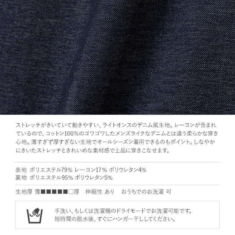 デニムとあったので少し生地厚を想像してましたが厚くなく、少し薄い?と思うほどしなやかでストレッチのきいた生地です。
