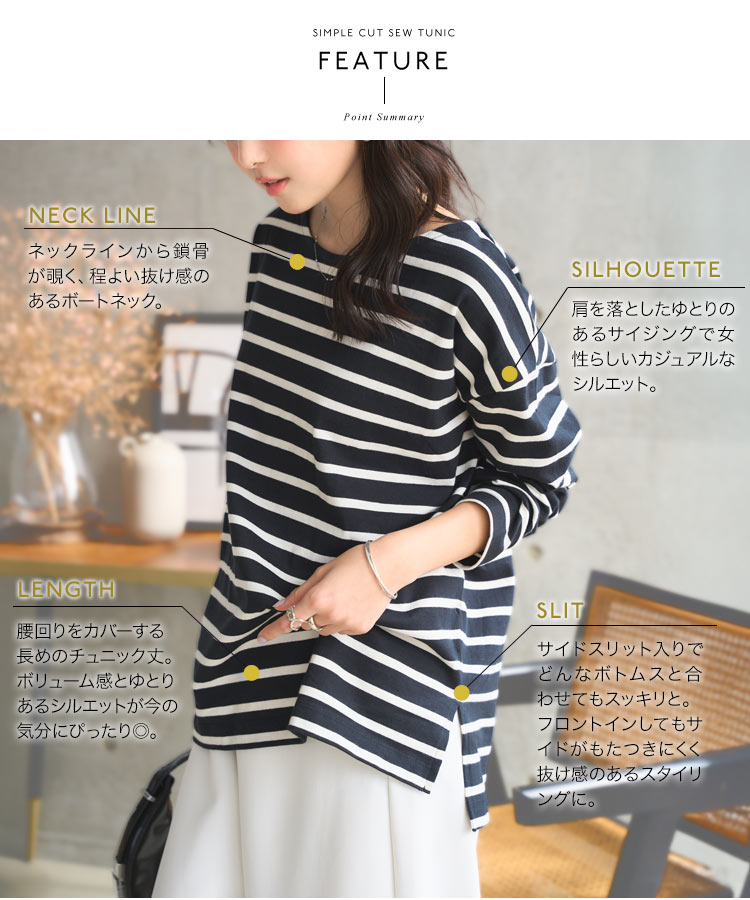 ≪ シークレットセール ≫ボーダー カットソー レディース 長袖 Tシャツ ボーダートップス チュニック ロンt [ 無地 パネルボーダー ボーダー ][ M L ] シンプルカットソーチュニック コットン コットン100% 綿 綿100% ゆったり 大きいサイズ インナー クルーネック [C3864]