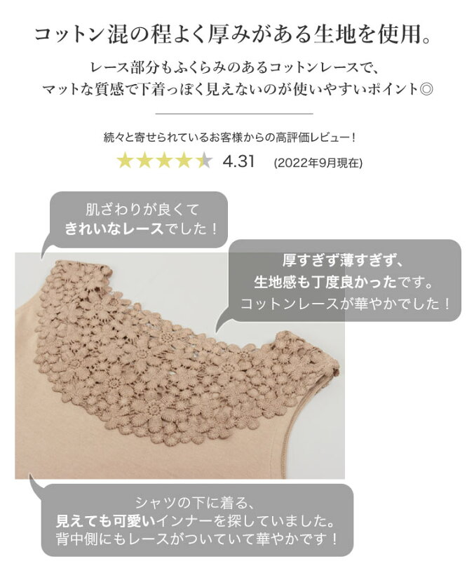 レースが綺麗なので、襟ぐりの開いたワンピースの魅せタンクとして、着回します♪
