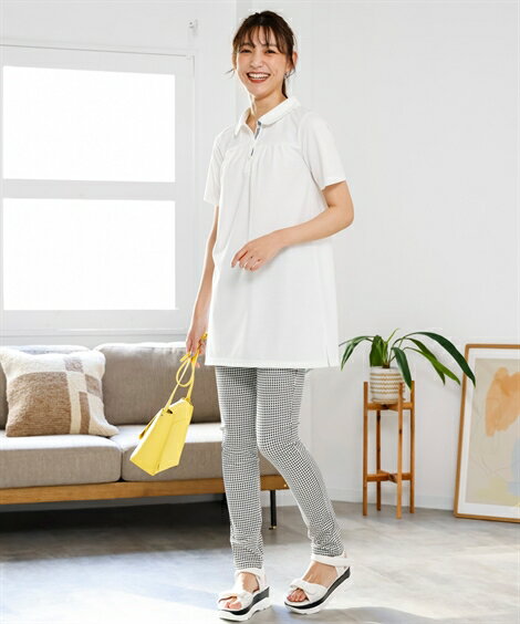 チュニック 大きいサイズ レディース 吸汗速乾 UVカット ポロ 夏 オフホワイト 猫ドット柄 黒 L〜10L 体型カバー お尻隠れる ニッセン nissen