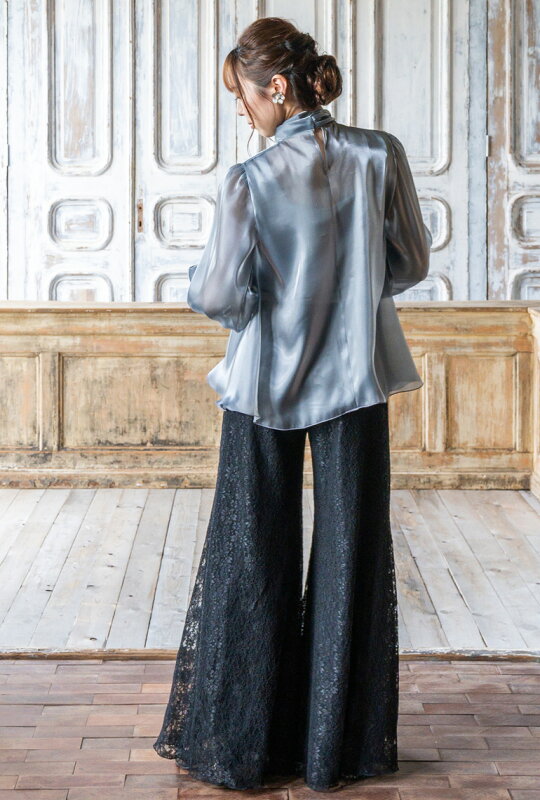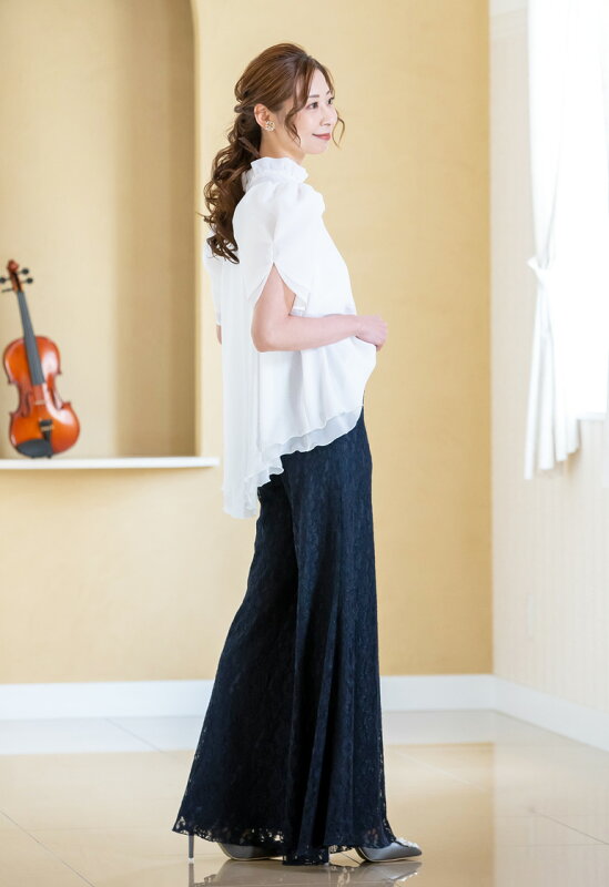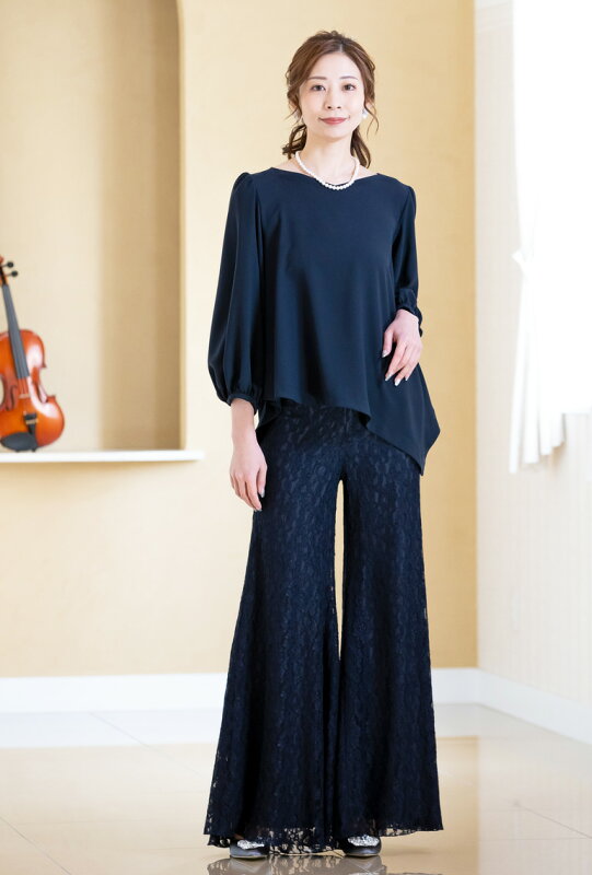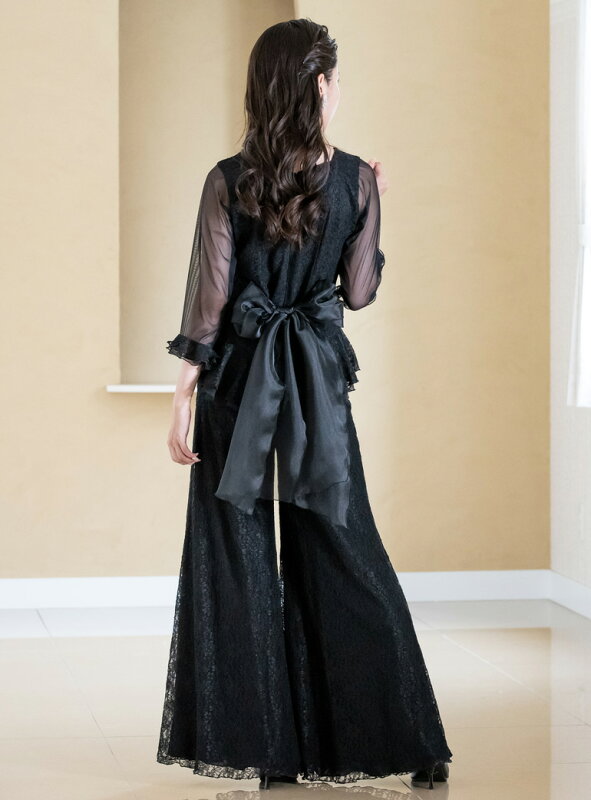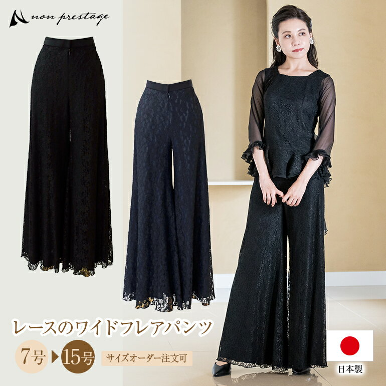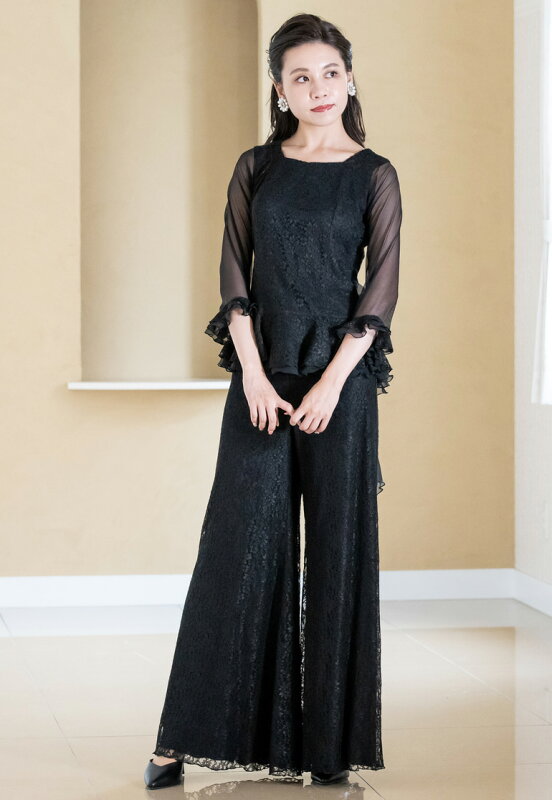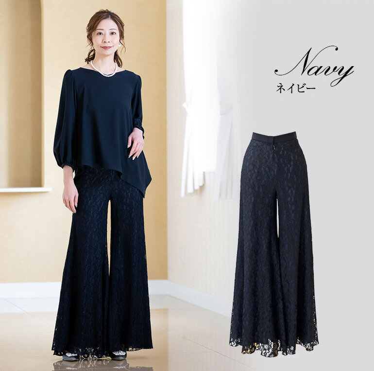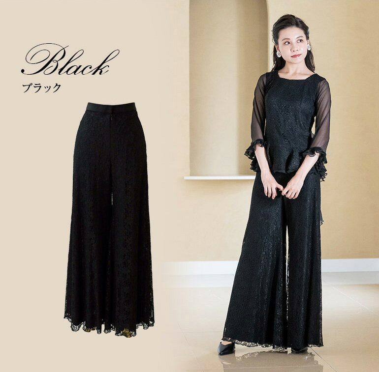 レース仕立ての ワイドパンツ 黒 パンツ パンツドレス 演奏会 フォーマル セパレートドレス コーラス 舞台 ステージ 衣装 レディース ゆったり 大きいサイズ ウエストゴム フレアパンツ きれいめ 柄 結婚式 着痩せ 体型カバー p3088