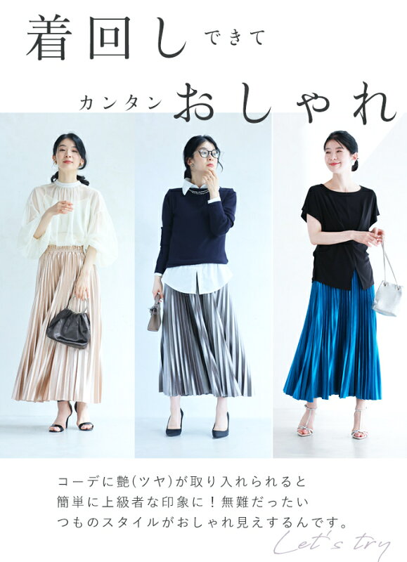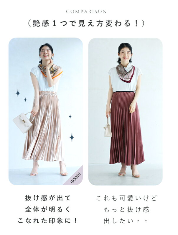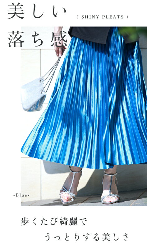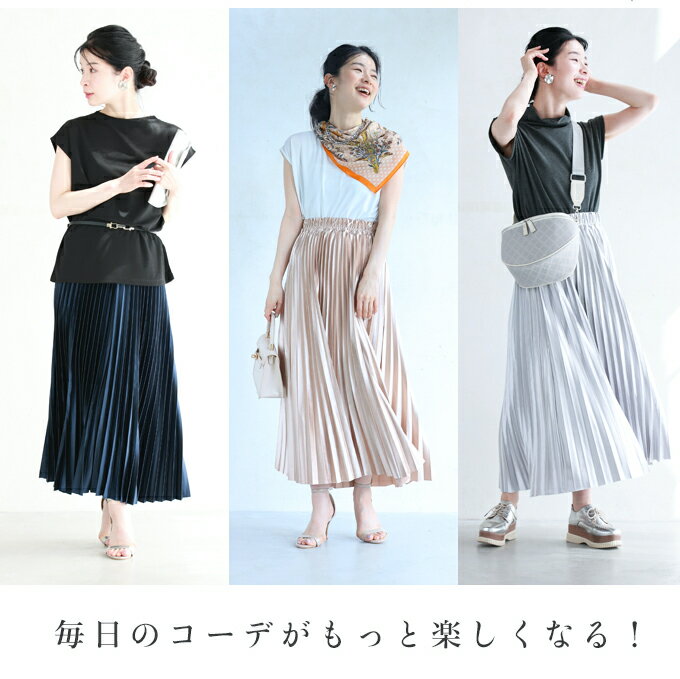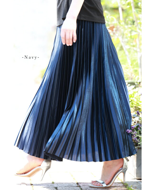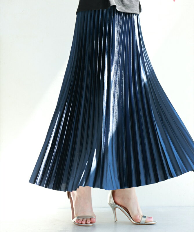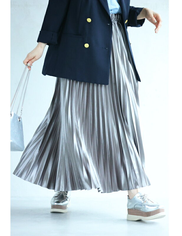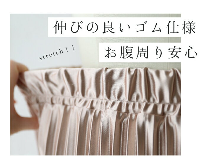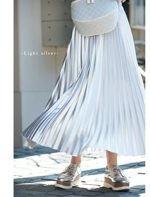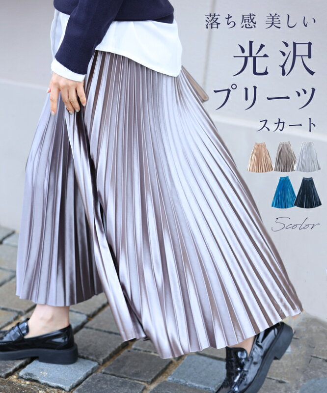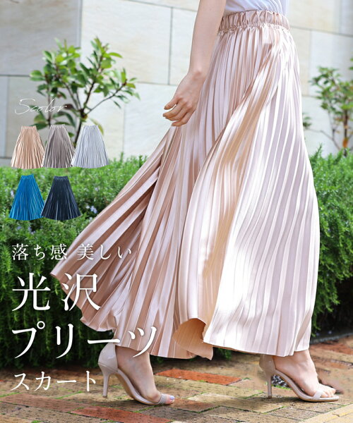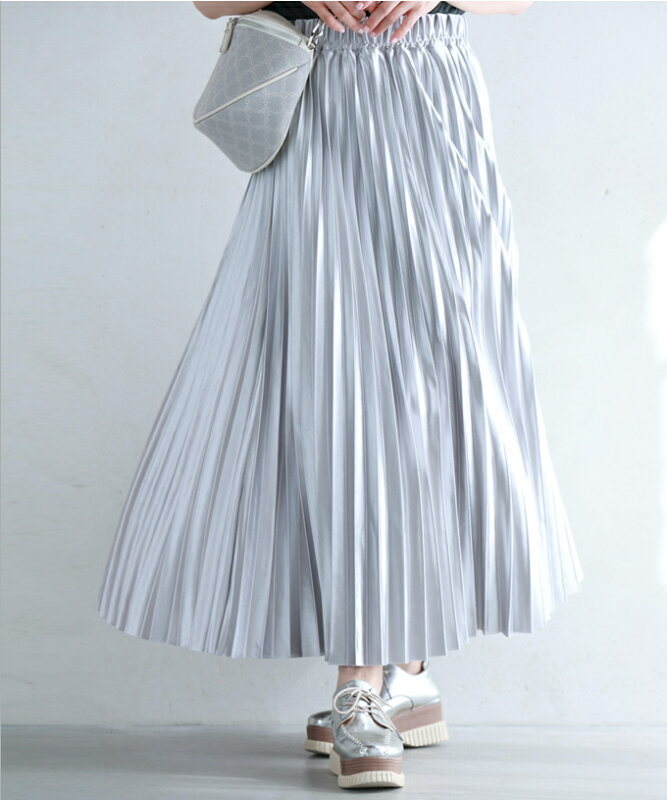 【再入荷♪6/5 12時&20時】(S~3L対応)落ち感 美しい 光沢 プリーツスカート プリーツ レディース ボトムス 体型カバー フレア ゴム ウエストゴム Aライン 無地 シルバー ゴールド 春 夏 高身長 低身長