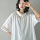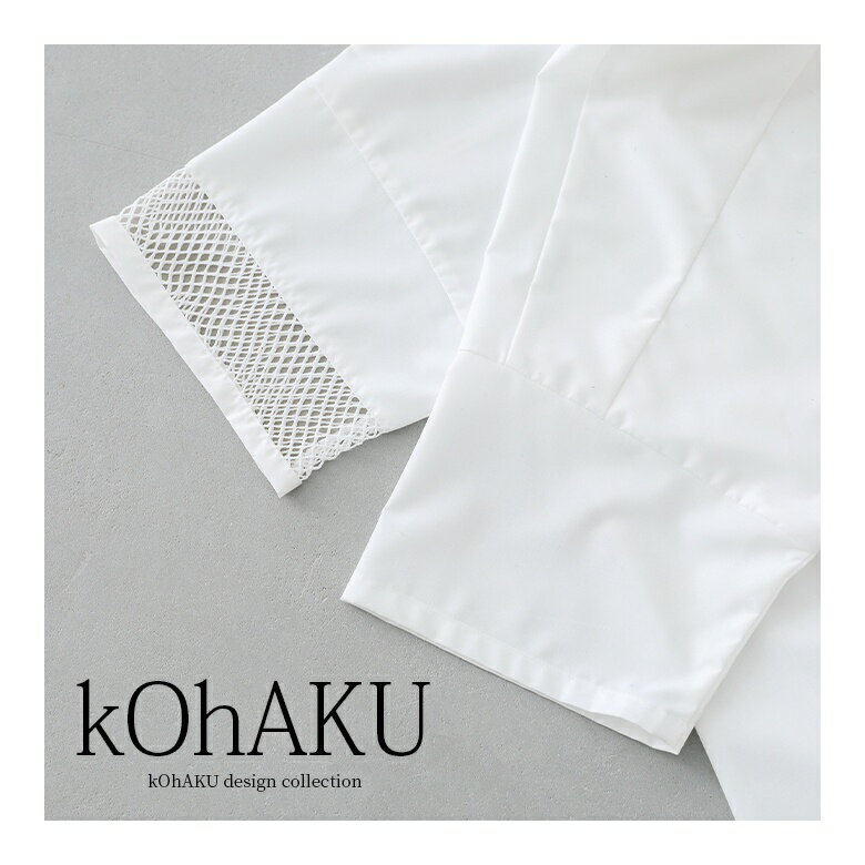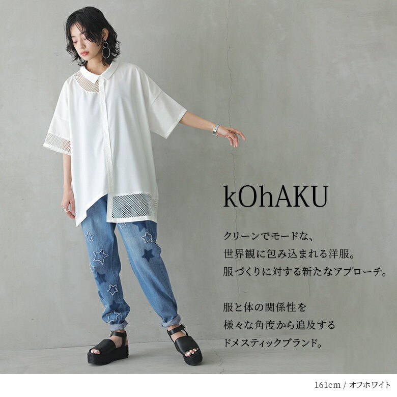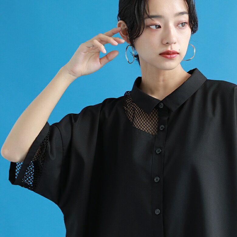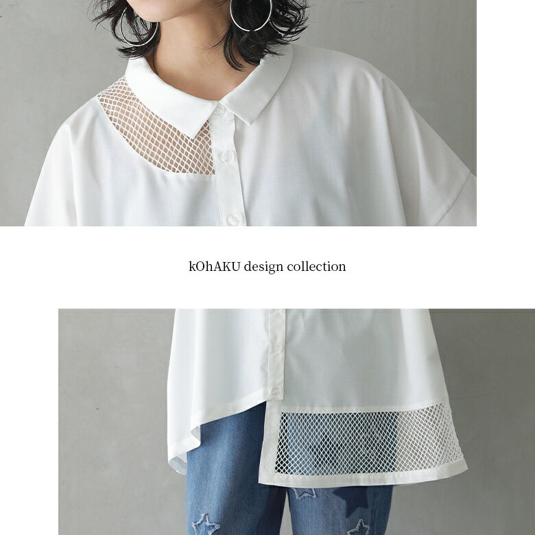 【全品送料無料】『メッシュ切替アシメデザインシャツ』[kOhAKU シャツ レディース 春夏 トップス 半袖 五分袖 襟付き アシンメトリー アシメ 変形 メッシュ 無地 タック ドロップショルダー 肌見せ オーバーサイズ モード]※メール便可※【10】