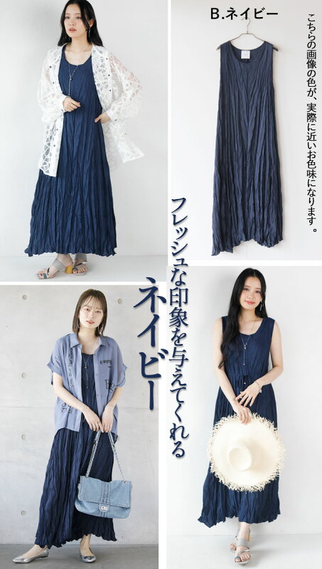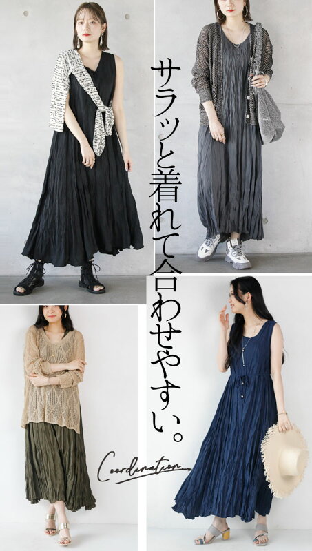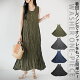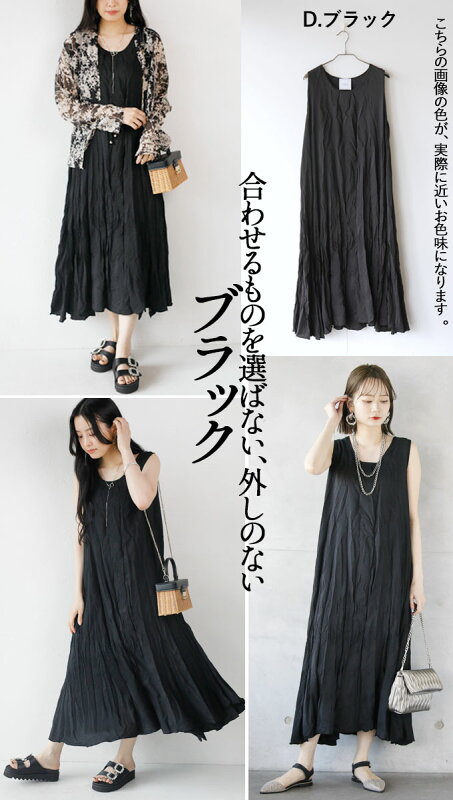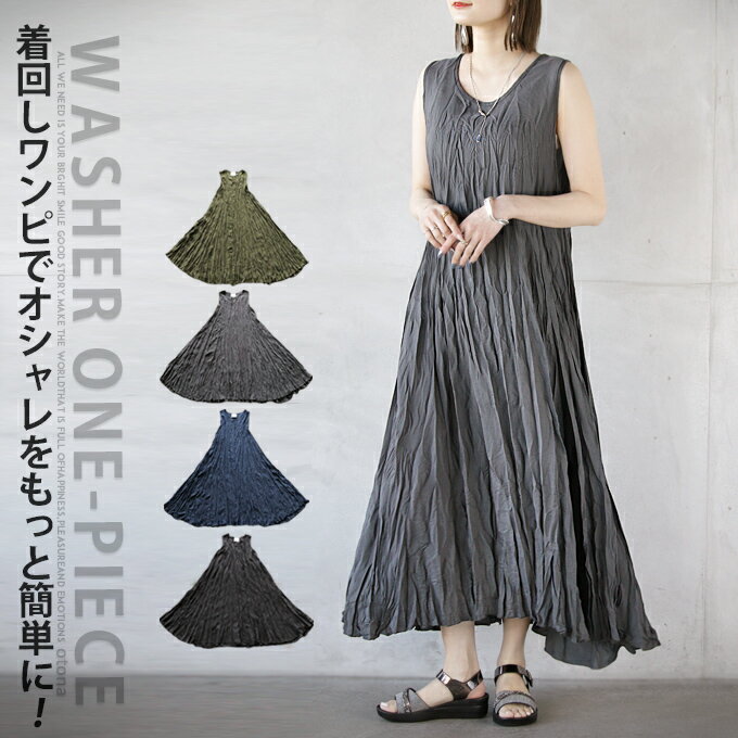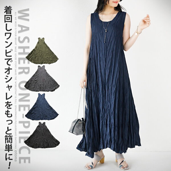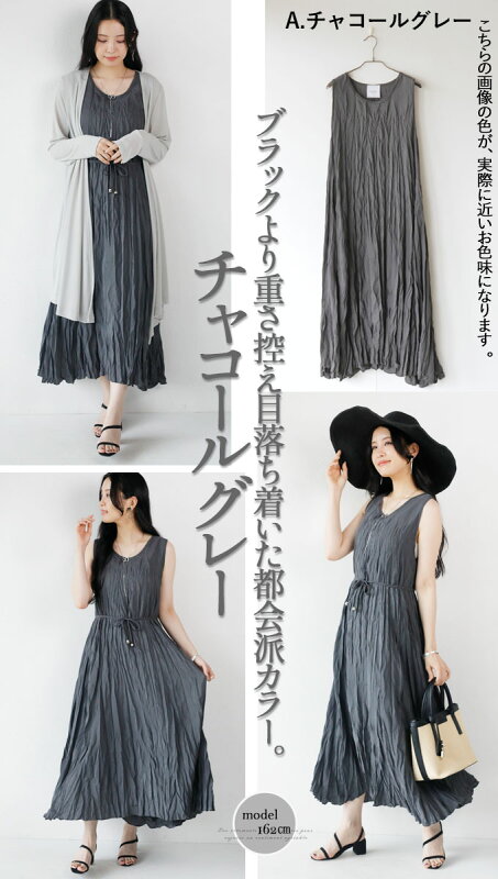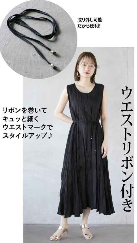 【再入荷】ワンピース レディース チャコールグレー ネイビー カーキ ブラック 春 夏 秋 冬 ノースリーブ 薄手 ロング丈 ワッシャー加工 フレア 無地 ウエストリボン付き ゆったり 着回しワンピでオシャレをもっと簡単に! 5/15