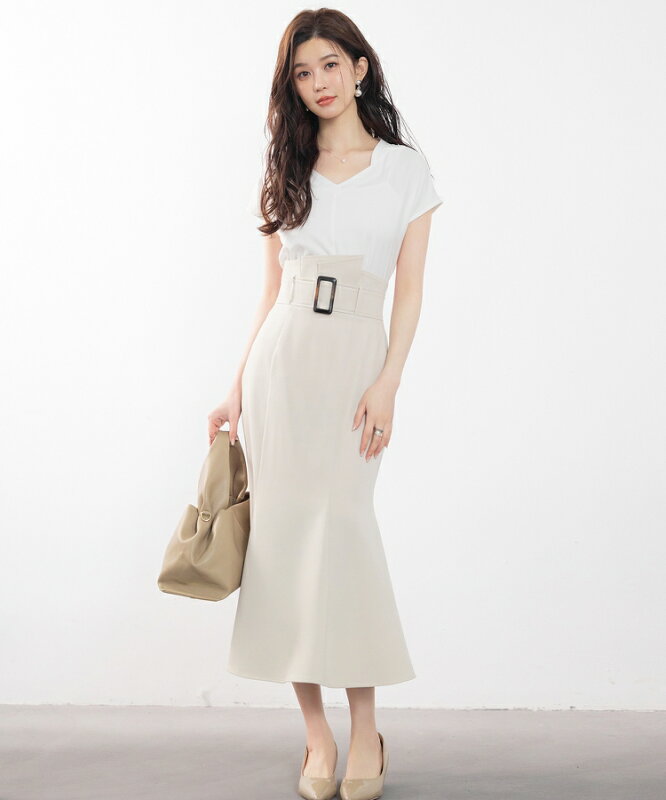 マーメイドスカートは骨盤や下腹が目立つので似合うものが少ないのですが、このスカートはキュッとしたハイウエスト、飾りベルトのおかげか気になりません。