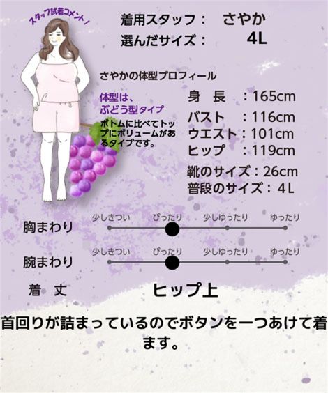 バスト110の私ですが、4Lを買い、切り返しがあるからか、とてもゆったりして着心地良いです 最初にラズベリーを買いましたが、ブルーとグレーを買い、毎日着回してます 黒は猫がいるので、猫の毛が目立ってしまい買えませんが、追加で白を注文しました 出来れば、もっと他の色も作って欲しいです