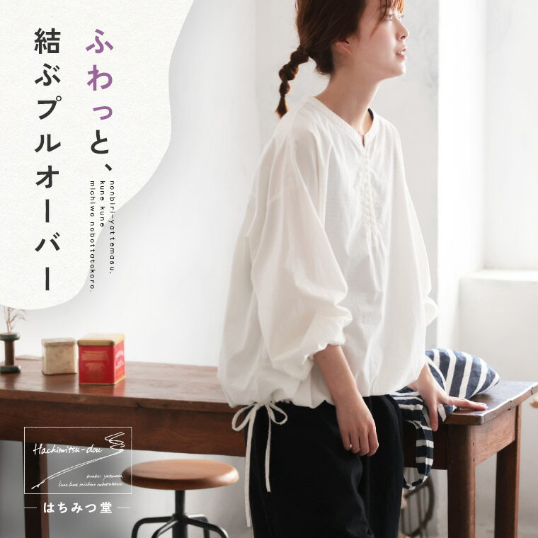 はちみつ堂 ふわっと、結ぶプルオーバー M/L/LL/3L/4L/5Lサイズ レディース/ブラウス/長袖/パフスリーブ/ノーカラー/キーネック/綿/コットン/トップス