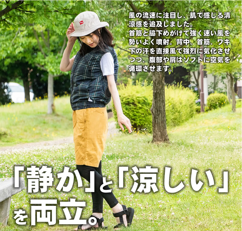 猛暑の中、外で使用しましたが音は気にならないのですが、4段階の2レベルの風が背中の膨らみを見られて恥ずかしくない所だと感じました。