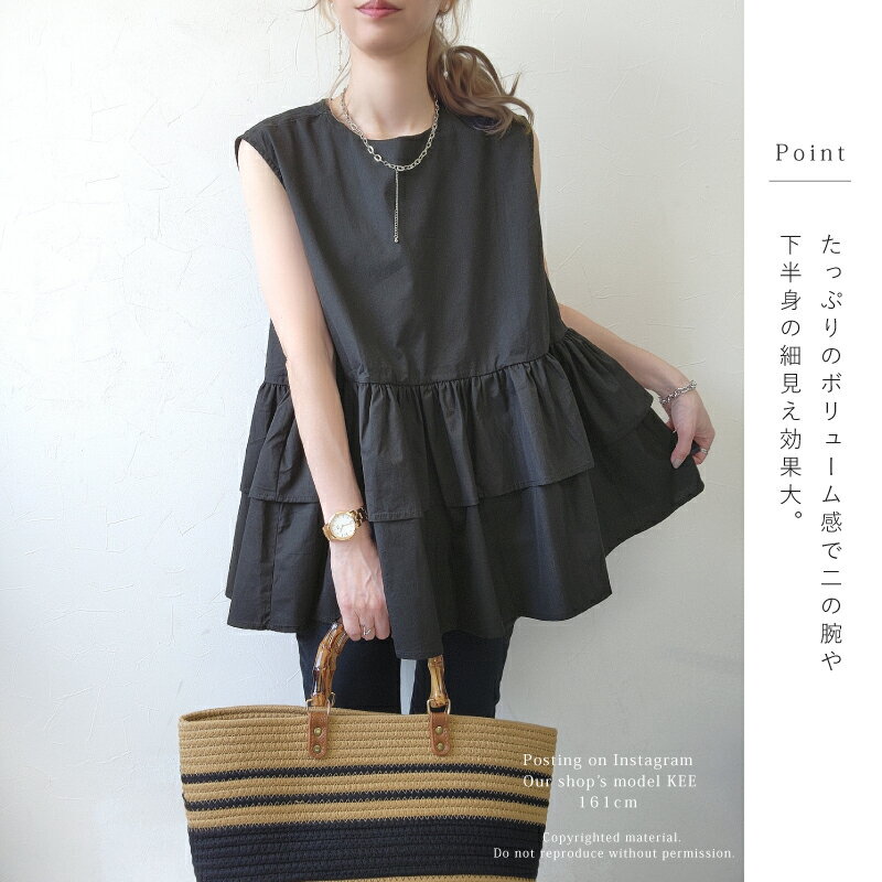【一部予約】チュニック ノースリーブ ブラウス レディース ティアードチュニック ペプラム [ティアード ペプラムブラウス フレア フリル ギャザー ブラウス フレンチスリーブ ブラック ホワイト チェック 春 夏 ショート丈ワンピ 体型カバー マタニティ ゆったり]
