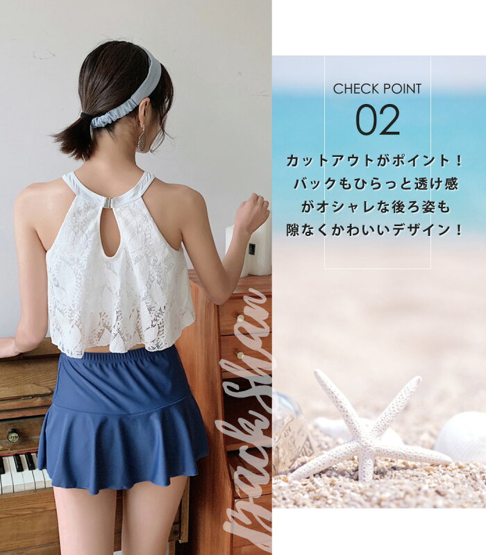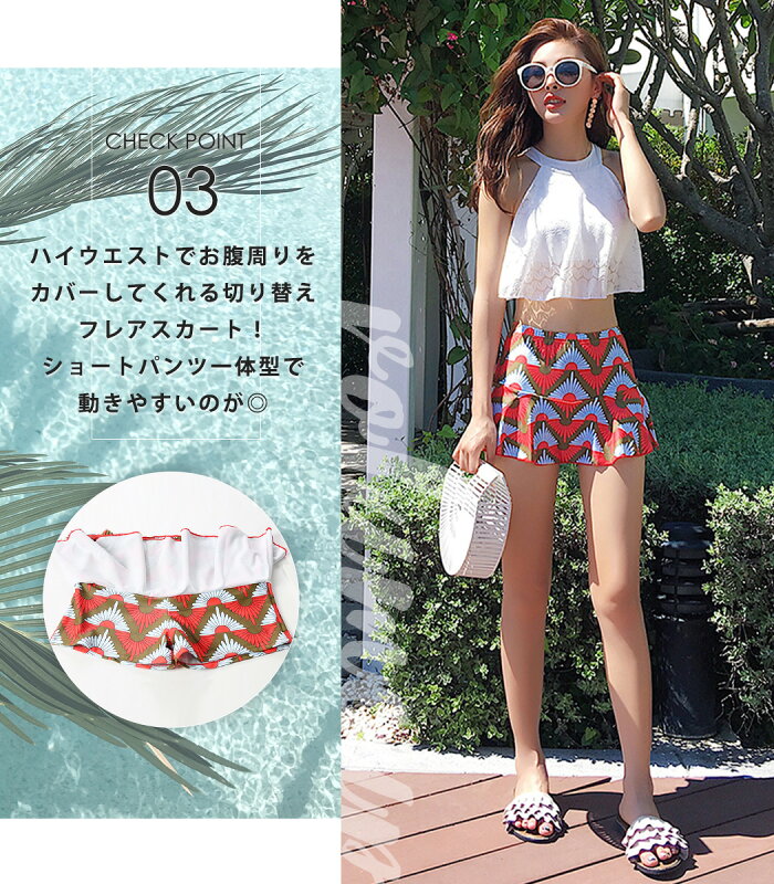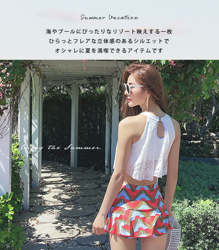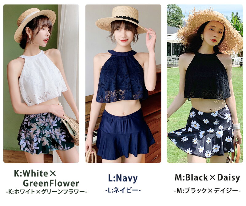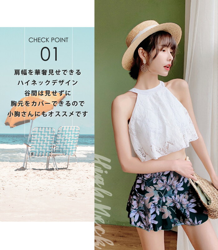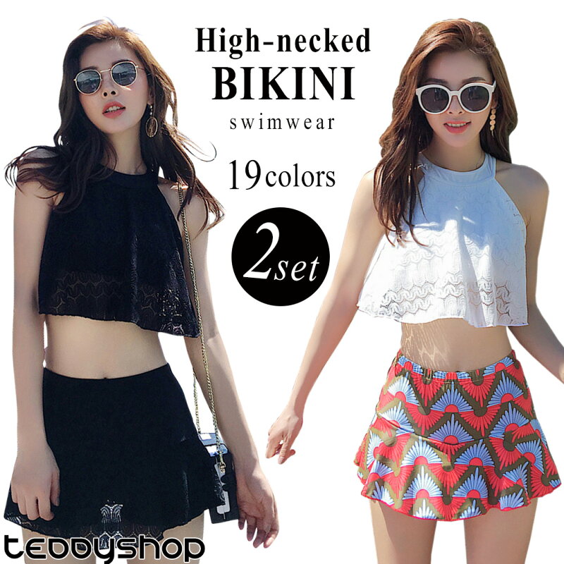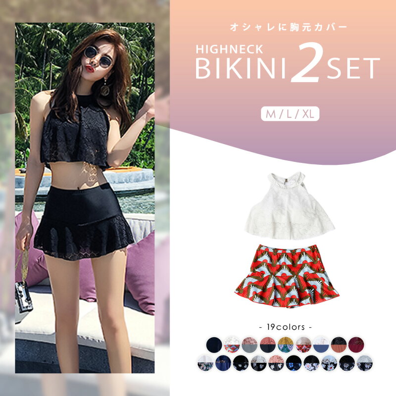 【24H限定:800円OFF!2点購入&クーポン利用で】水着 レディース 体型カバー水着 ハイネック ビキニ スカート 2点セット ママ水着 20代 30代 40代 オトナ女子 レース 無地 上下別柄 フレア バックシャン かわいい セクシー パッド付き 小胸 バスト 盛れる お洒落 黒 白