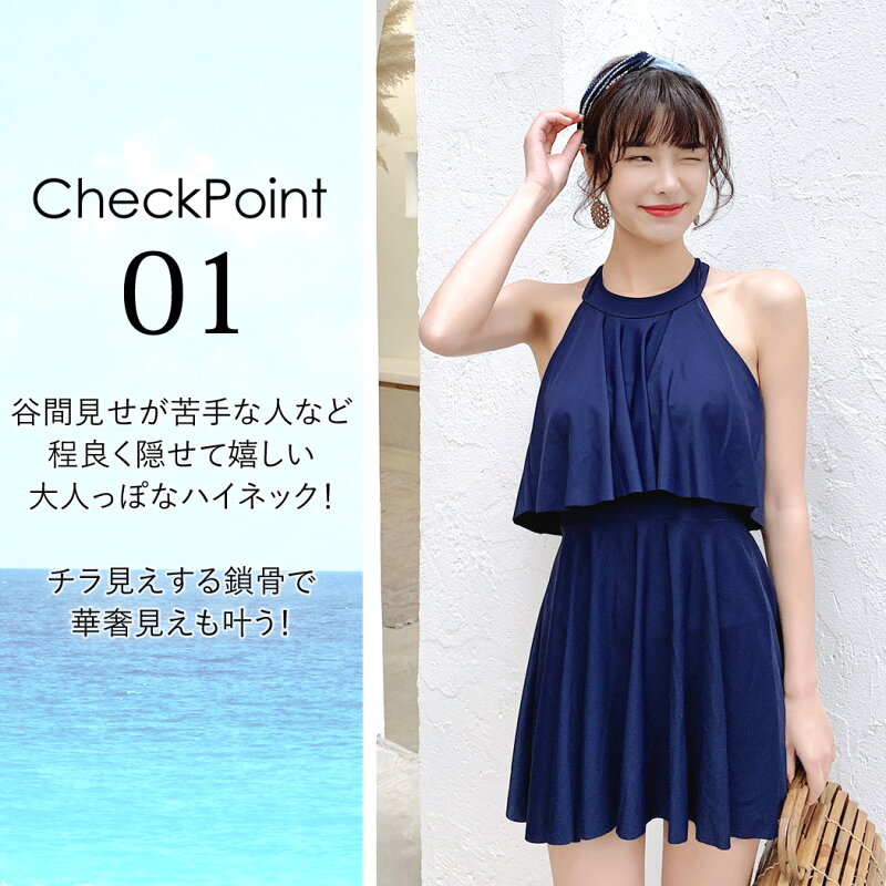 【24H限定:800円OFF!2点購入&クーポン利用で】水着 ワンピース レディース オールインワン ハイネック 体型カバー水着 ママ水着 20代 30代 40代 ぽっちゃり オトナ女子 大きいサイズ フリル フレアスカート 可愛い チェック セクシー お腹 お尻 太もも カバーアップ 黒