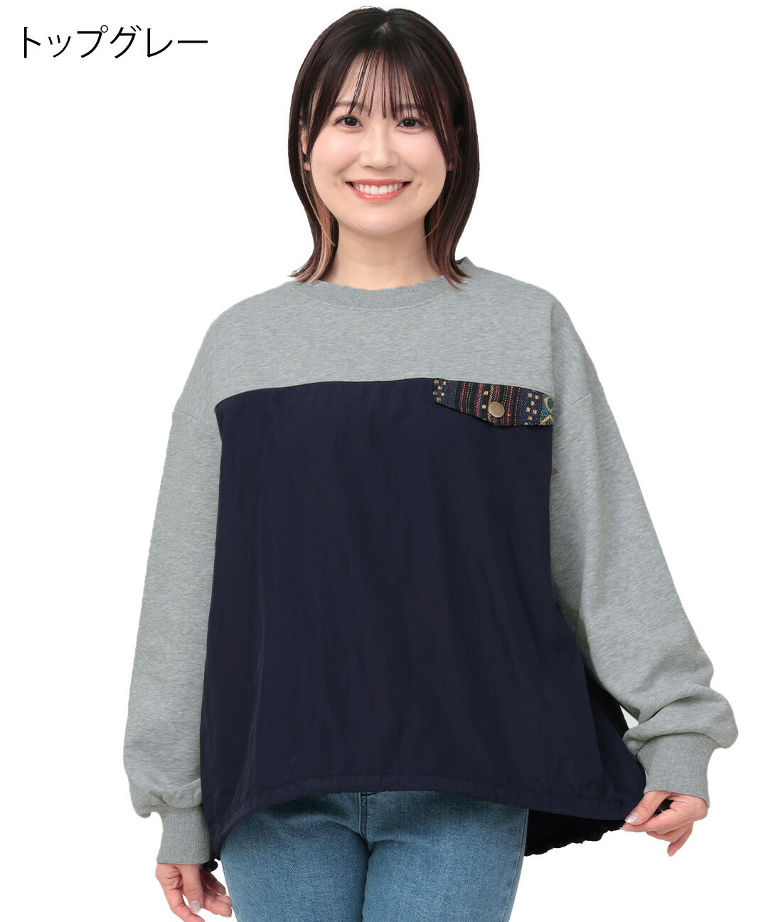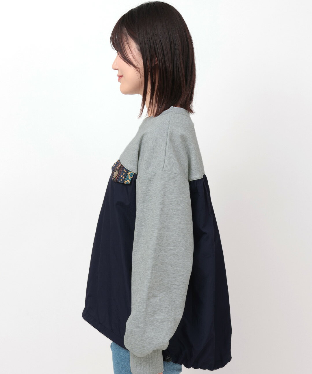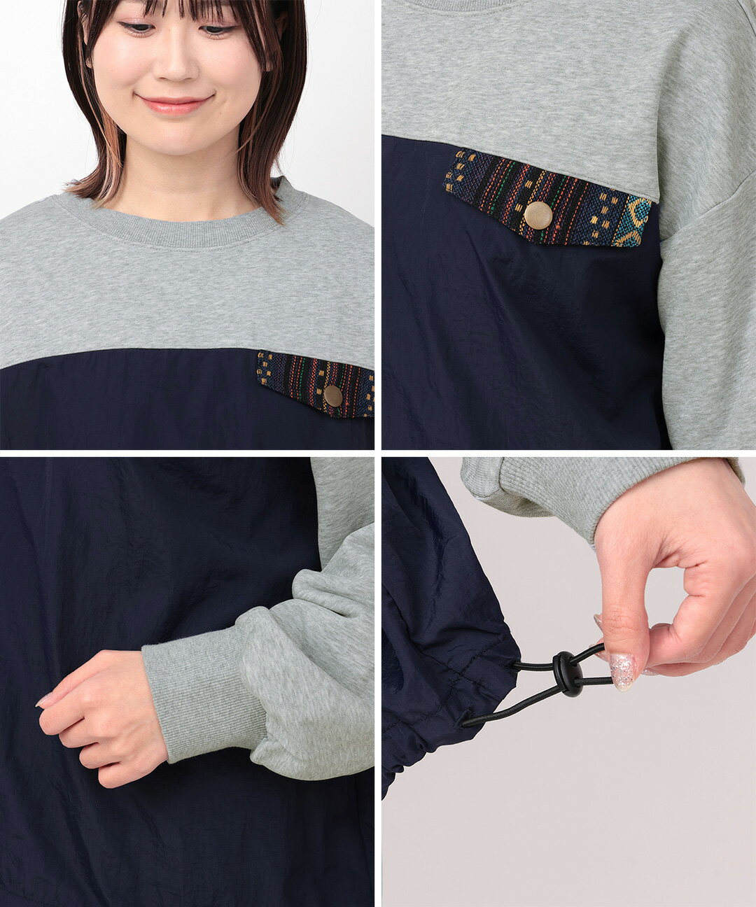ナイロンコンビプルオーバー / スウェット ナイロン 異素材ミックス 裏毛 ゆったり オーバーサイズ トレーナー トップス レディース 春 秋 冬 長袖 シャカシャカ ドロスト ワーク ジャカード オートミール トップグレー チャコールグレー エスニック チチカカ TITICACA