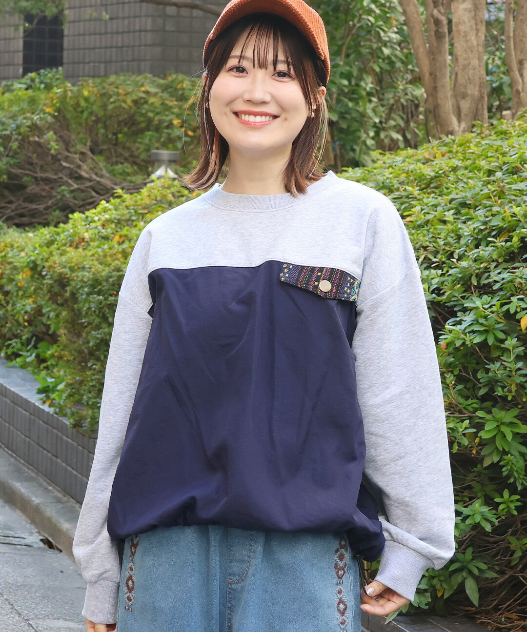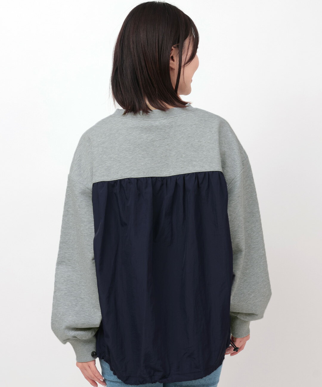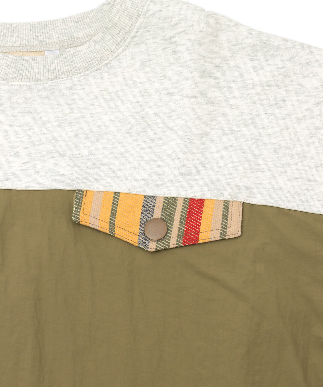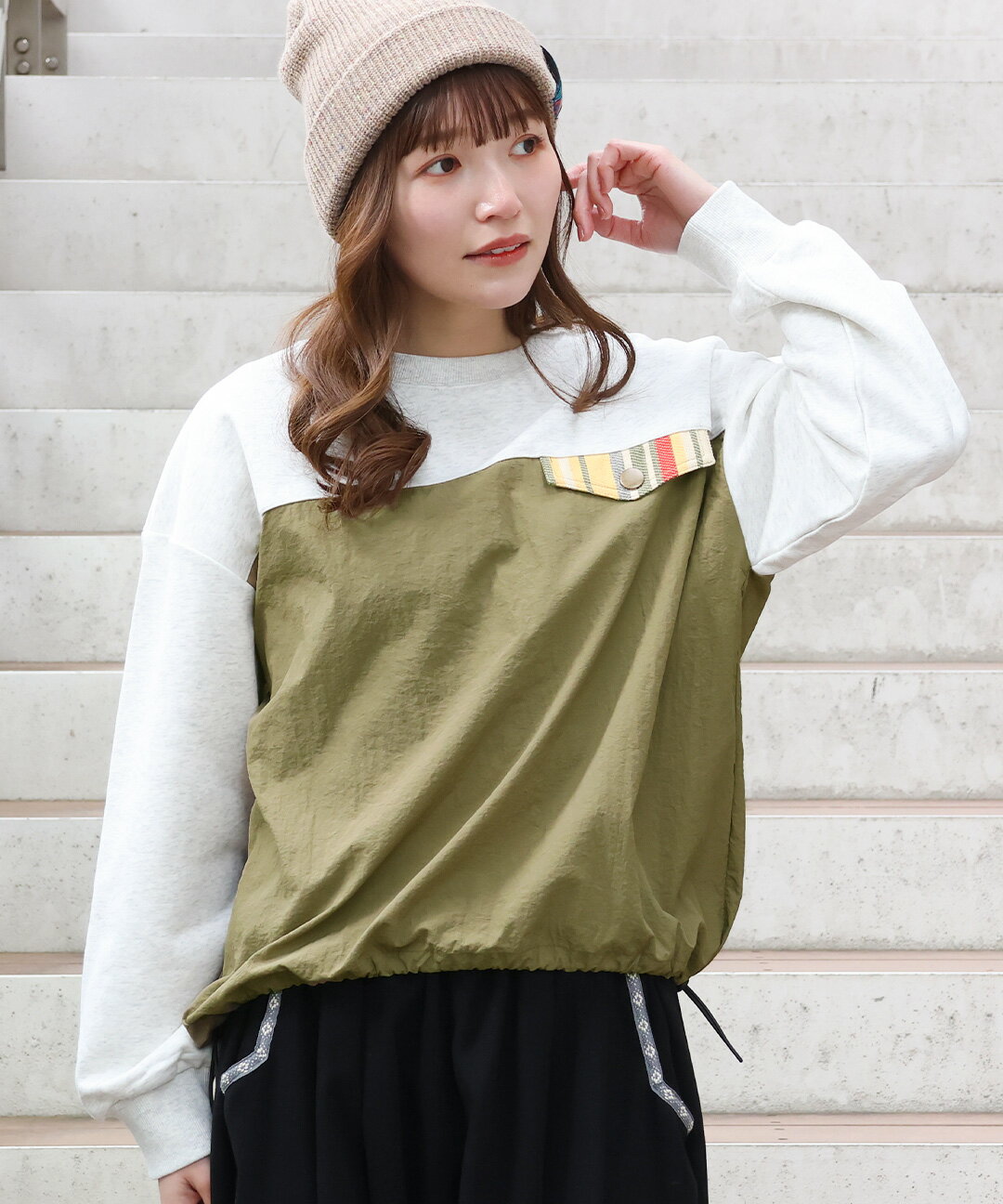 ナイロンコンビプルオーバー / スウェット ナイロン 異素材ミックス 裏毛 ゆったり オーバーサイズ トレーナー トップス レディース 春 秋 冬 長袖 シャカシャカ ドロスト ワーク ジャカード オートミール トップグレー チャコールグレー エスニック チチカカ TITICACA