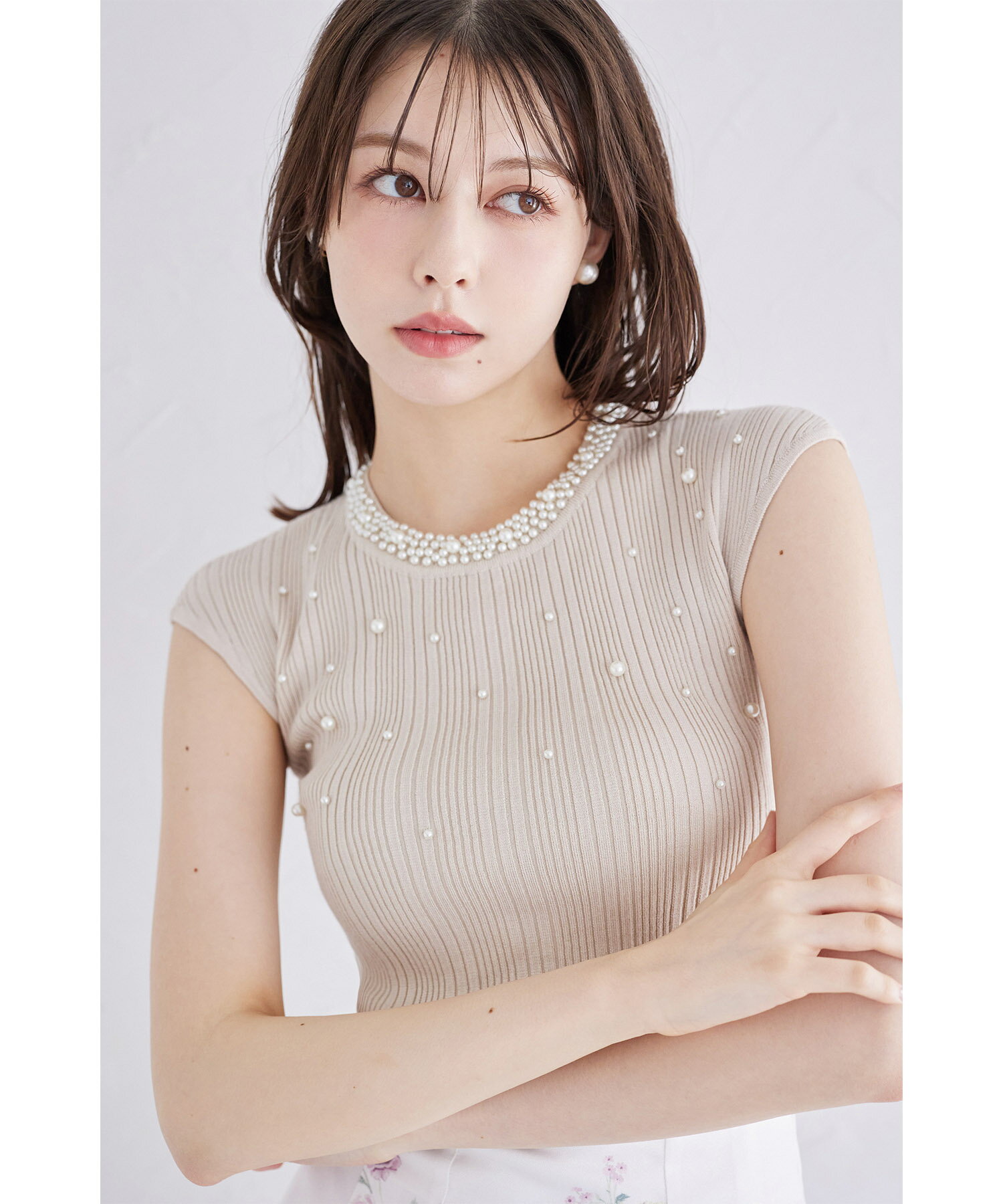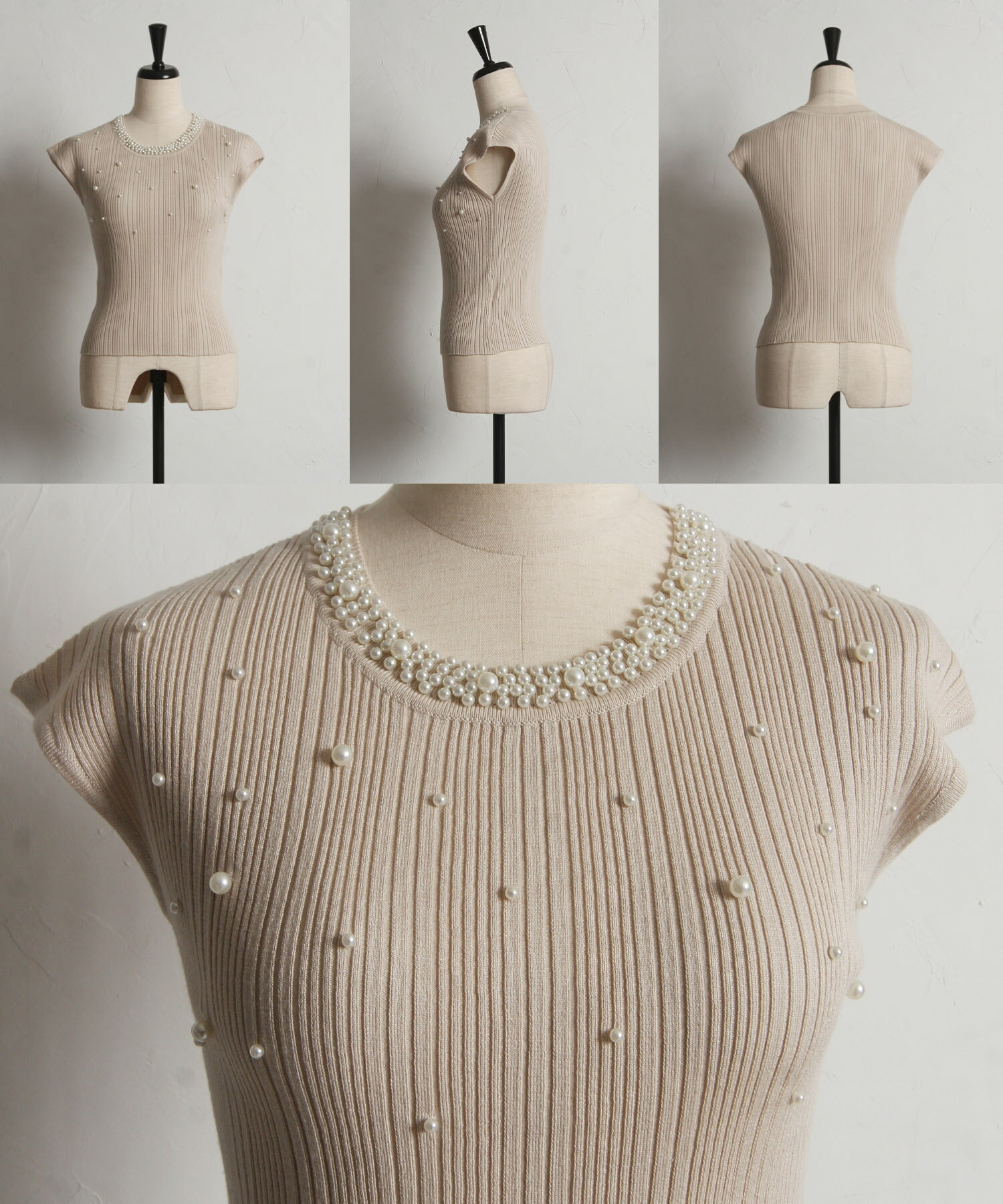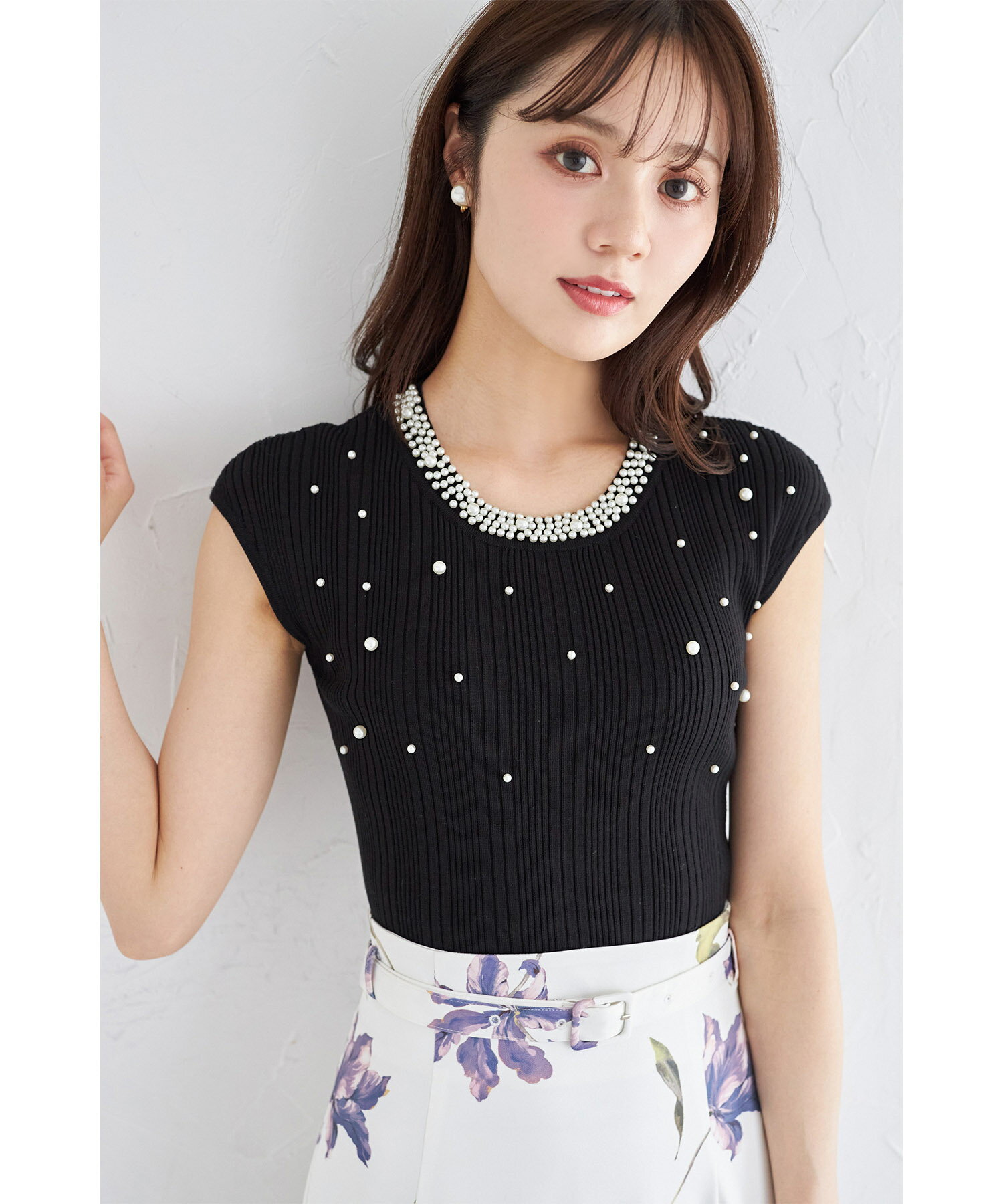 パール付きフレンチスリーブリブニットプルオーバー【carlita カリータ】tocco closet(トッコクローゼット) ※麻亜里さんはブラック着用 ブラック ベージュ 商品番号:186-196713