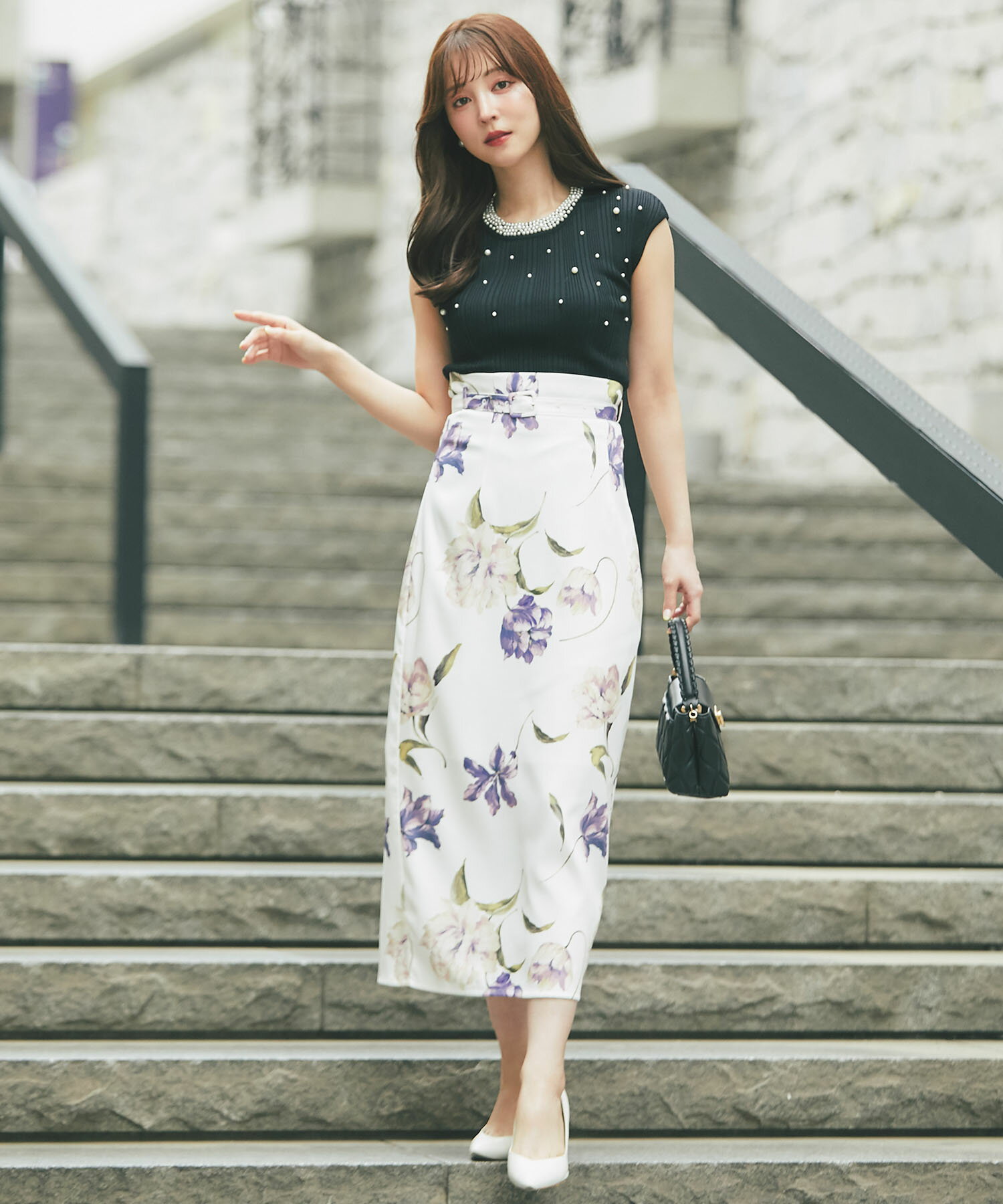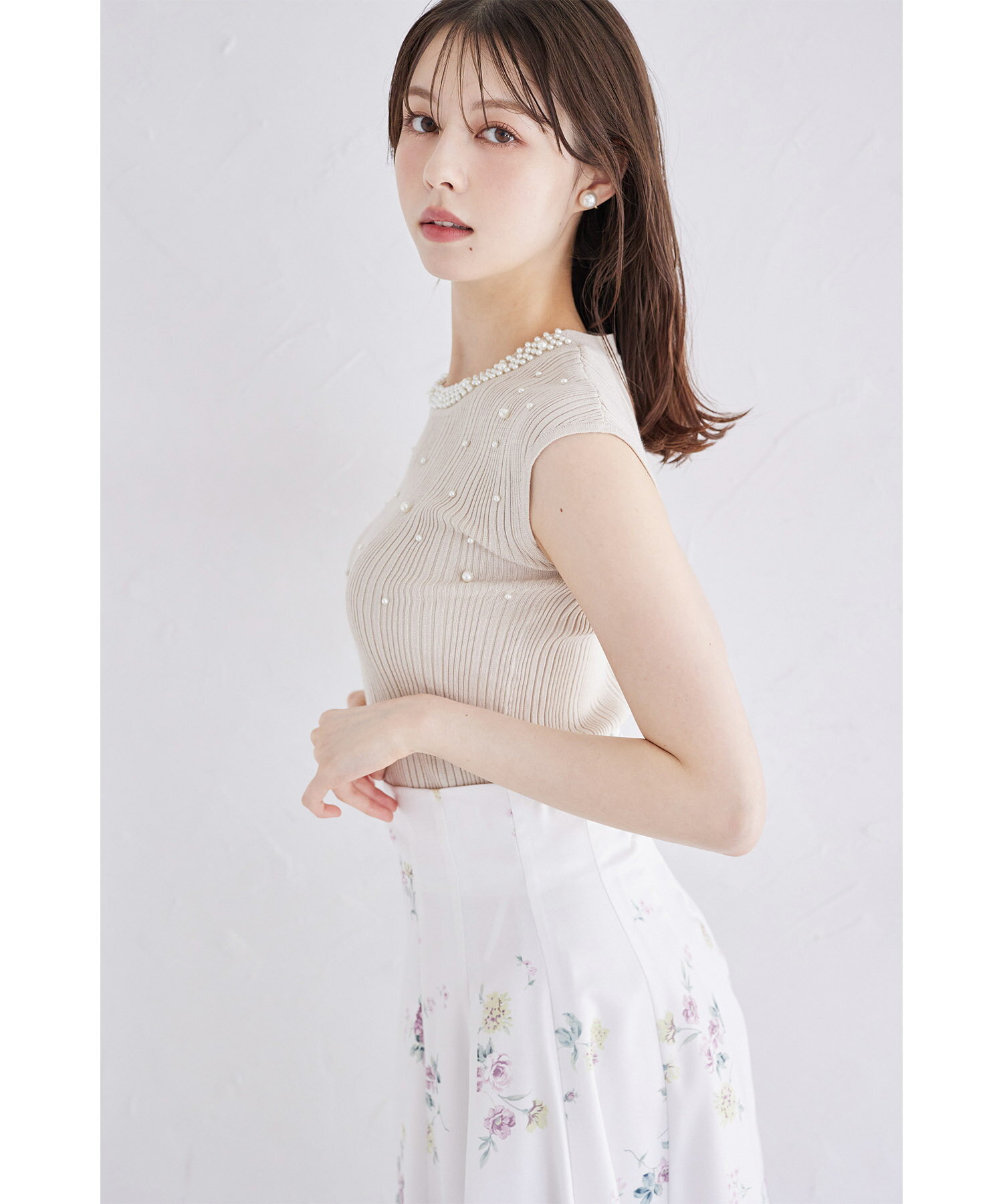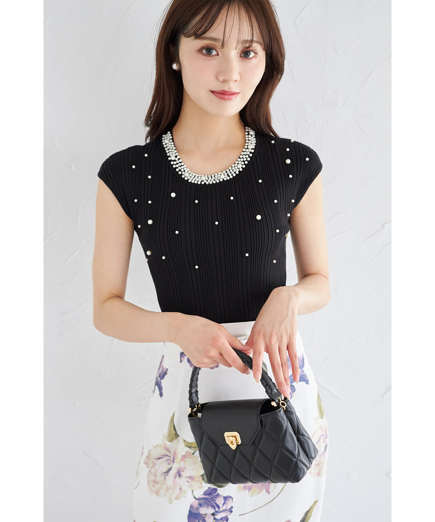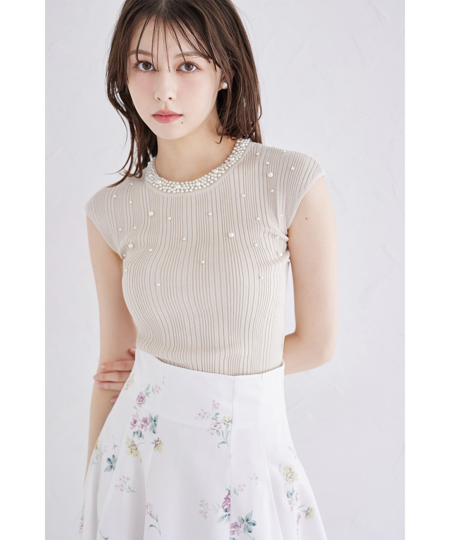 パール付きフレンチスリーブリブニットプルオーバー【carlita カリータ】tocco closet(トッコクローゼット) ※麻亜里さんはブラック着用 ブラック ベージュ 商品番号:186-196713