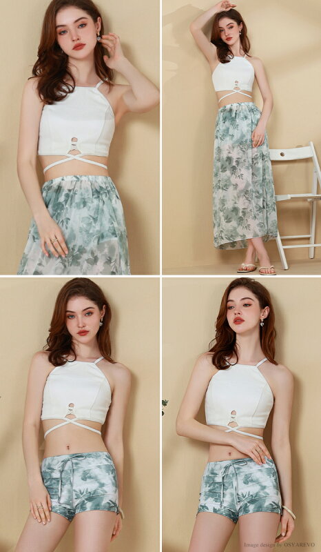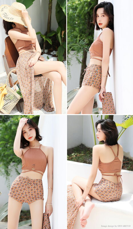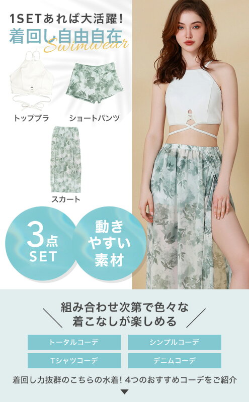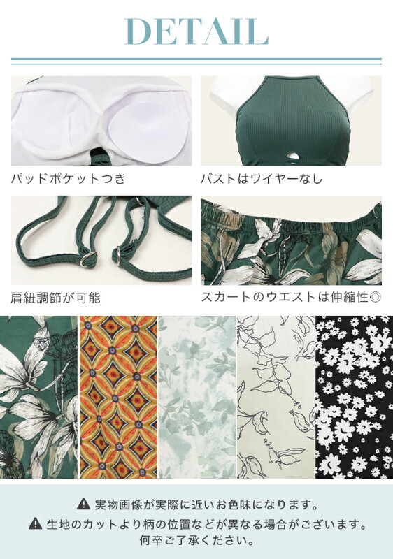 【クーポン利用で3,680円】水着 レディース 体型カバー ビキニ バンドゥ ハイネック 3点セット エスニック柄 無地 ロングスカート パレオ M L LL ママ 体型カバー水着 30代 40代 50代 セパレート オトナ女子 リゾート 一部予約販売