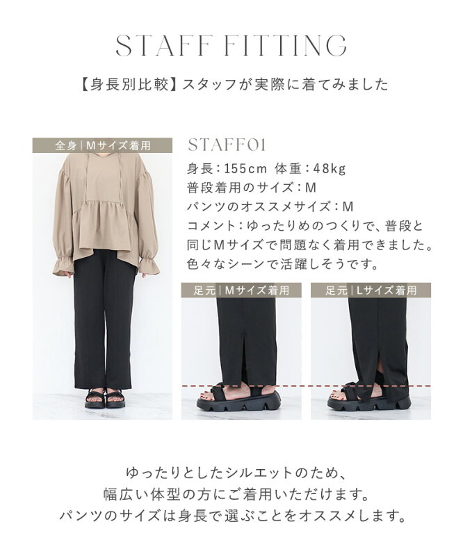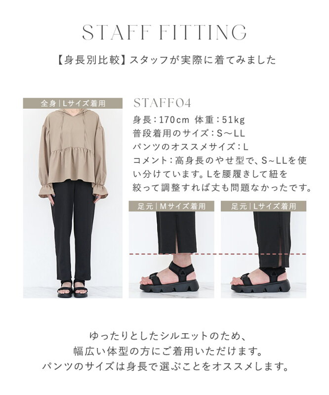 162cmでゆったり着たかったのでLサイズを購入しましたがパンツの長さはぴったりでした。