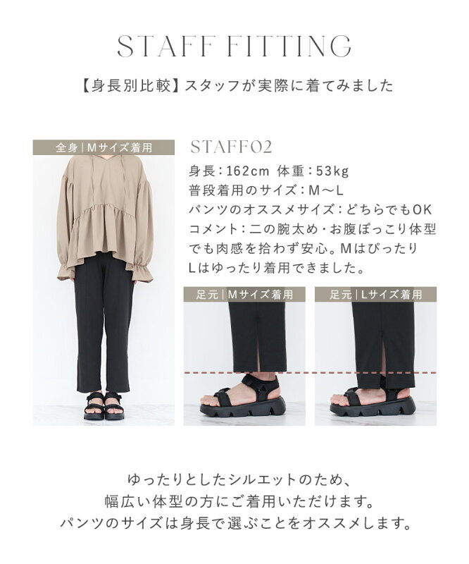 160cm、普段はLかXLを着ていますがパンツMでパツパツすぎず丈もちょうど良かったです。