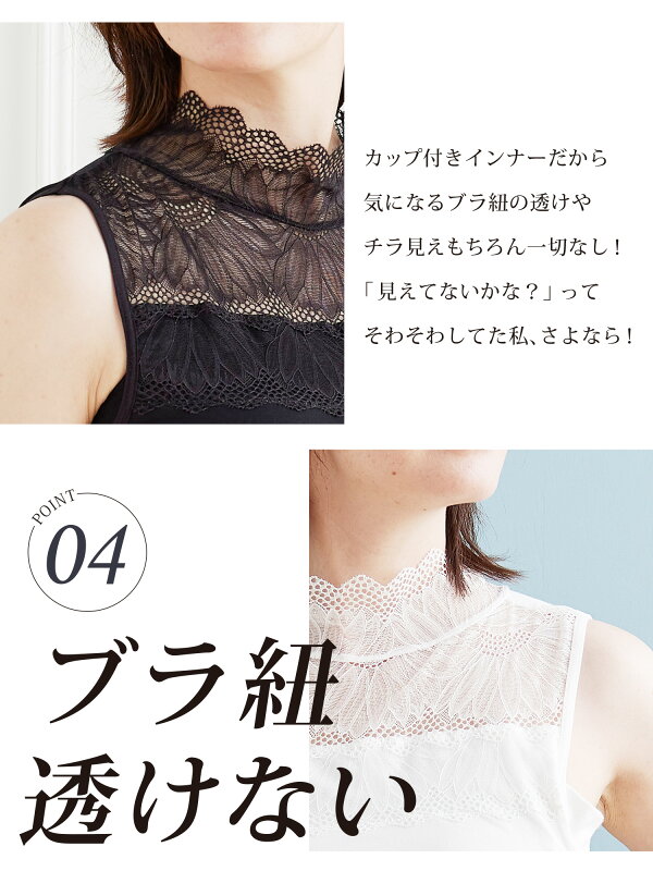 [スーパーSALE 2セットで20%OFFクーポン対象] [新発売] 2色組 カップ付き レースインナー 汗取り布付き フィットブライン インナー ハイネック ノースリーブタイプ / 綿混 成形カップ 肌を隠す 見せインナー ブラトップ ノンワイヤー 脇汗 2s10o 4h20