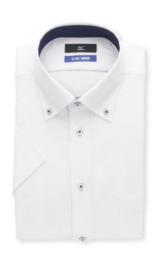 【洋服の青山】ミズノ ワイシャツ 半袖 メンズ 盛夏用 ホワイト 白 ストライプ ボタンダウン 形態安定 シワになりにくい 清涼 涼感 涼しい すぐ乾く 速乾 吸汗速乾 動きやすい ビジネス ビジネスカジュアル クールビズ トップス Yシャツ カッターシャツ MIZUNO アイスタッチ