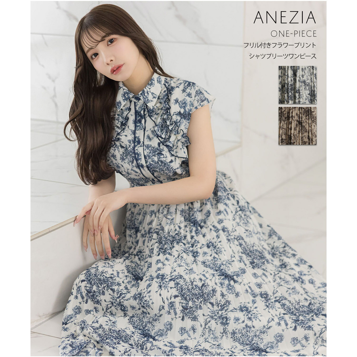 フリル付きフラワープリントシャツプリーツワンピース【anezia アネジア】tocco closet(トッコクローゼット) ネイビー ブラック 商品番号:186-196289