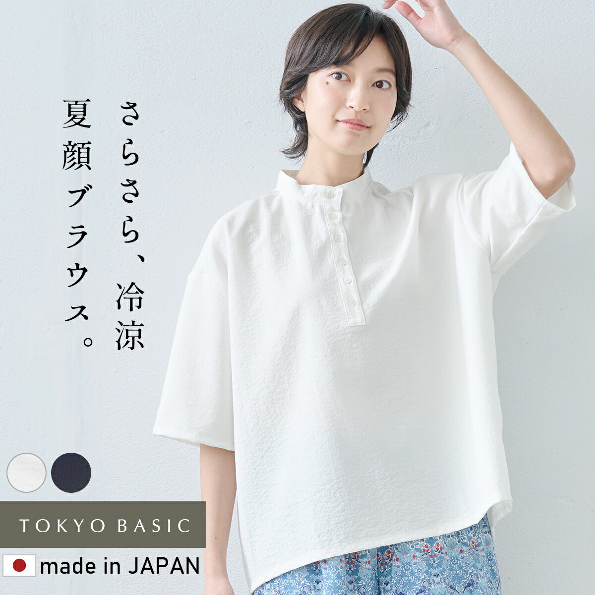 【新作】[ ブラウス レディース トップス シアーシャツ ] 冷涼 サッカー ヘンリーネック ブラウス / 日本製 40代 50代 60代 ファッション シワになりにくい 夏 涼しい 薄手 五分袖 カジュアル 撥水 ストレッチ 速乾 春 夏 ゆったり サッカー生地